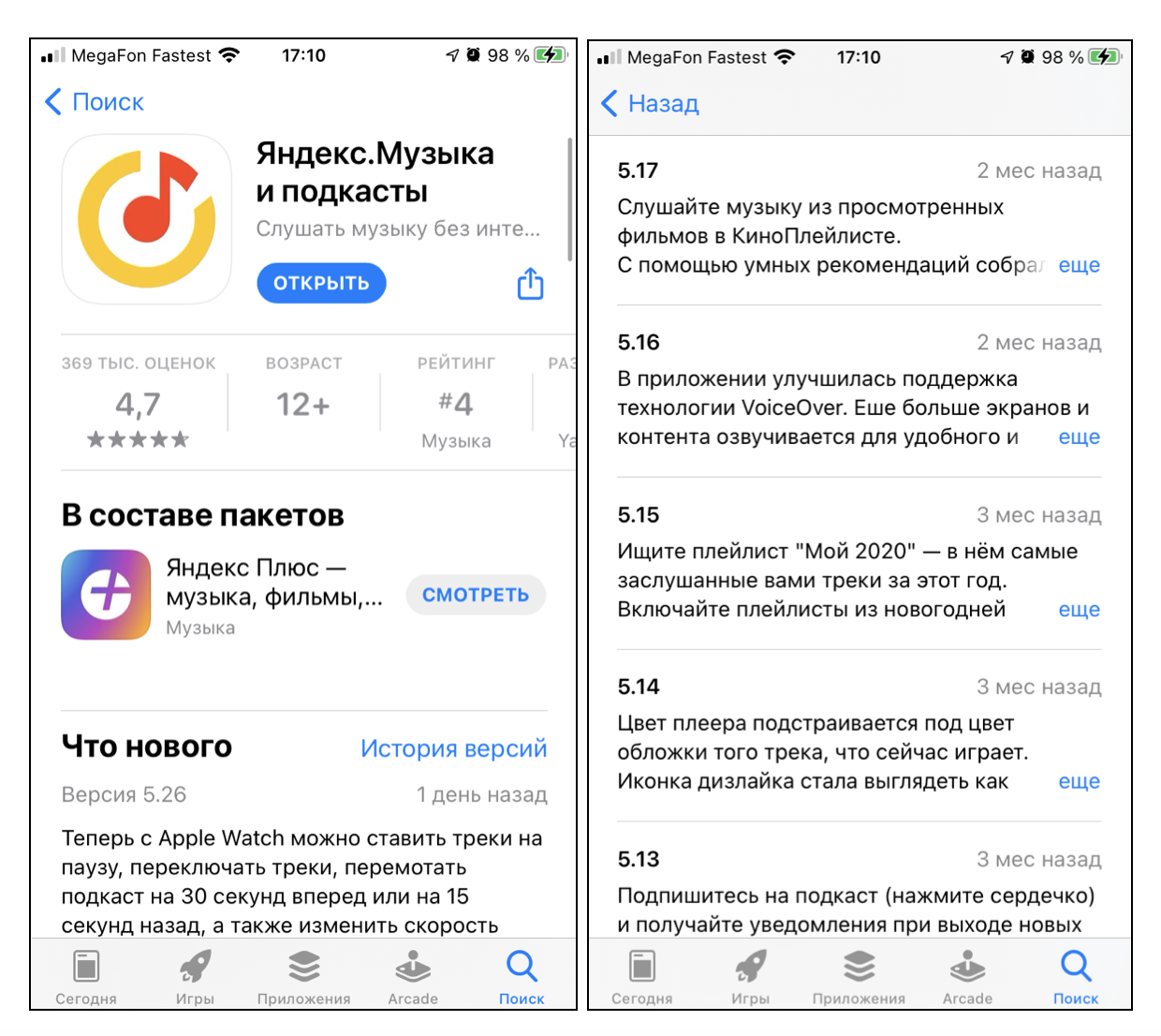 Часто разработчики не утруждают себя написанием осознанных текстов для истории обновлений и прикрепляют к каждому апдейту одно и то же сообщение в духе «исправлены ошибки, повышена стабильность». Выгодно от конкурентов отличается «Яндекс.Музыка»: из истории версий действительно можно узнать, что изменилось.