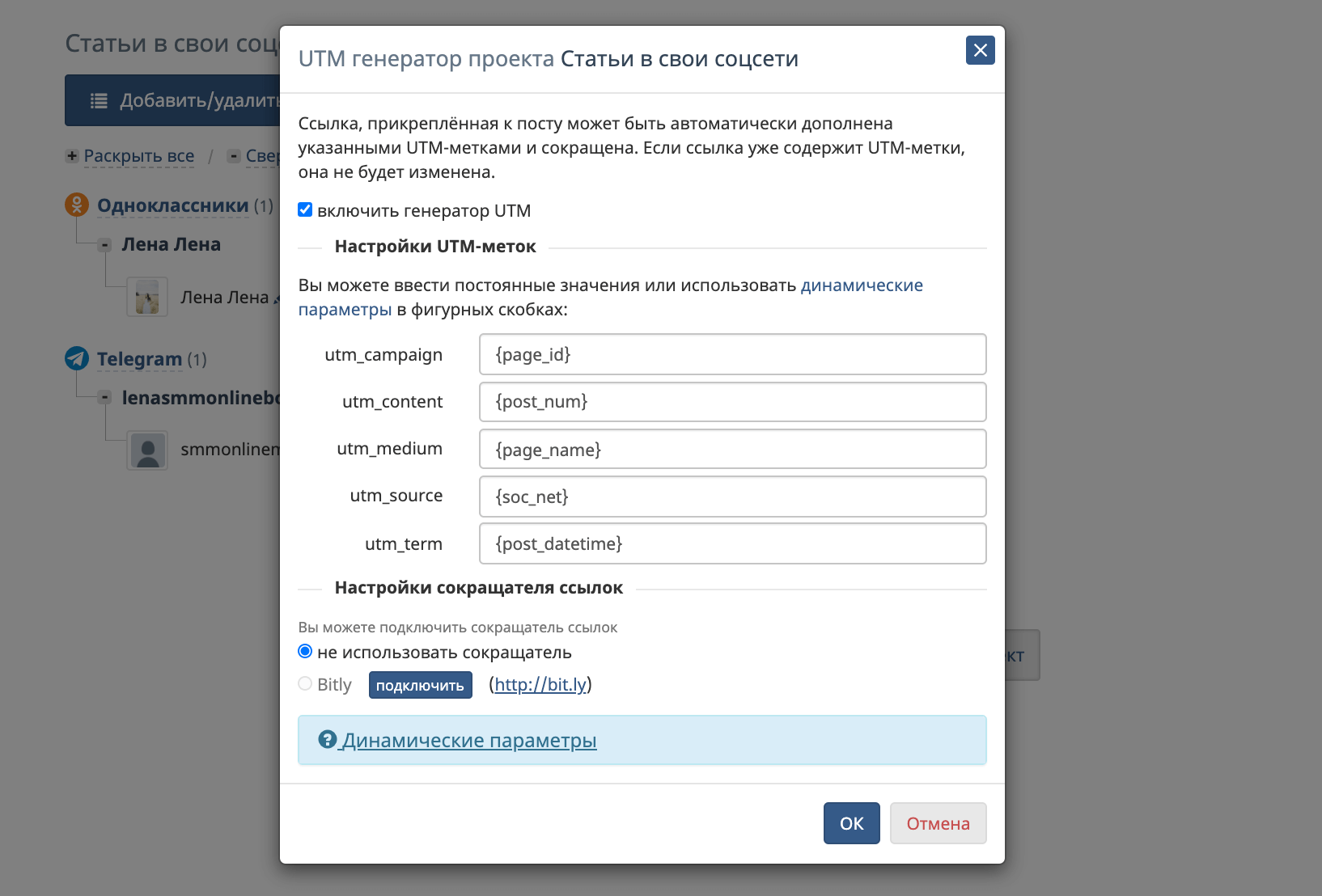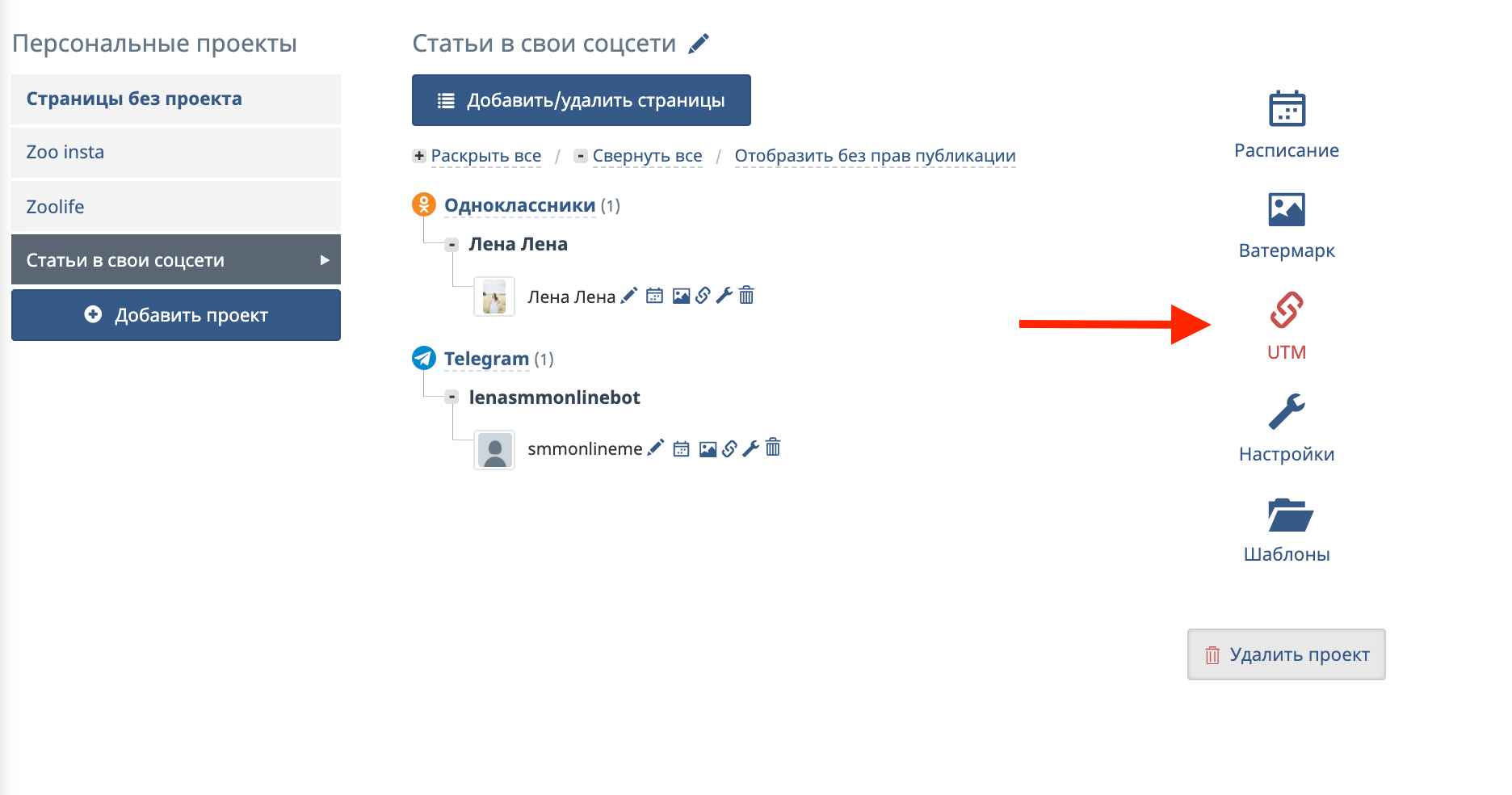Чтобы индивидуально настроить UTM, достаточно нажать на иконку возле проекта и указать нужные данные во всплывающем окне.