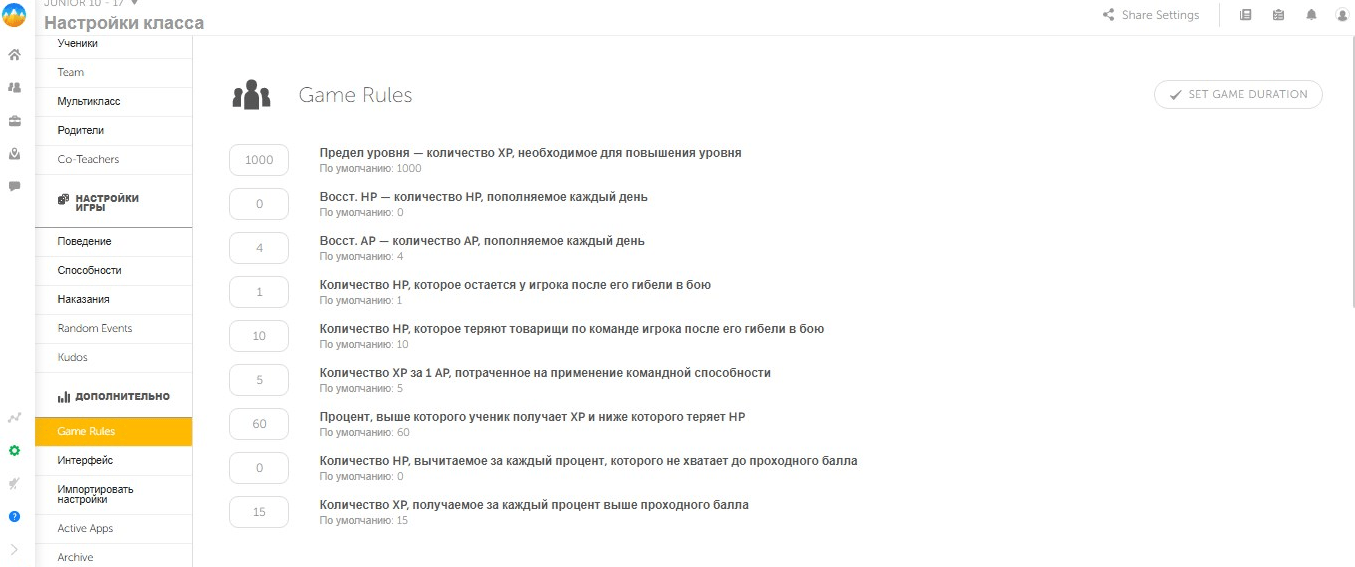 Каждая игра рассчитана на определенный период. При создании класса вам будет предложено выбрать длительность игры. Вы можете выбрать ограничение на один месяц. Например, перед уходом на каникулы, когда ребята должны сдать все долги, накопившиеся за учебный год. Вы создаете игру и для каждого ученика даете квест на прохождение заданий, где каждая локация — это его долг. Или, наоборот, можете растянуть игру на целый учебный год. Тут все зависит от вашей креативности.