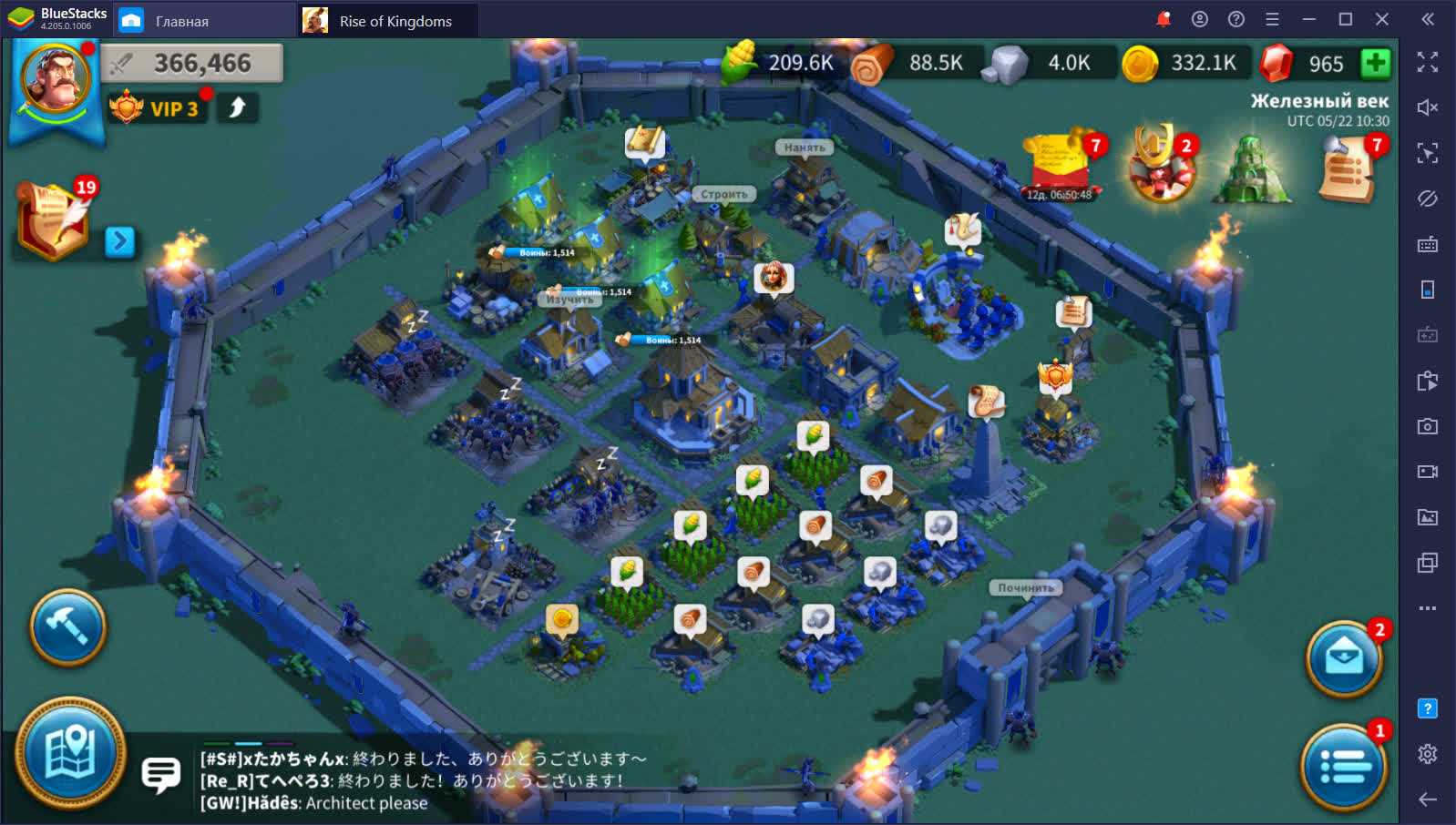 Игровую вселенную Rise of Kingdoms условно можно разделить на несколько зон: ваш город, его окрестности и окружающий мир — карту всей игровой локации. Здесь уместна аналогия с зумом в оптической технике: приближение камеры позволяет сосредоточиться на локальных действиях, и наоборот. Игры с подобной системой уже присутствуют в Google Play, но Rise of Kingdoms — одна из немногих, в которых переход между уровнями обзора происходит без дополнительных загрузок или промежуточных экранов. Чтобы приблизить или отдалить камеру, играя на BlueStacks, нажмите на стрелки “Вверх” или “Вниз” на клавиатуре или используйте клавишу Ctrl+вращение колесом мыши.