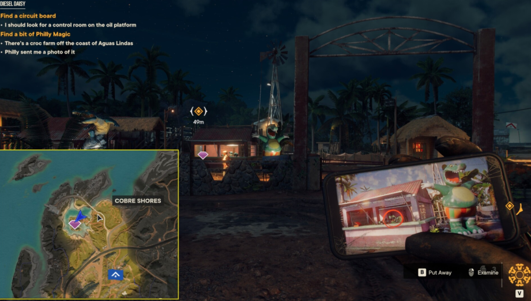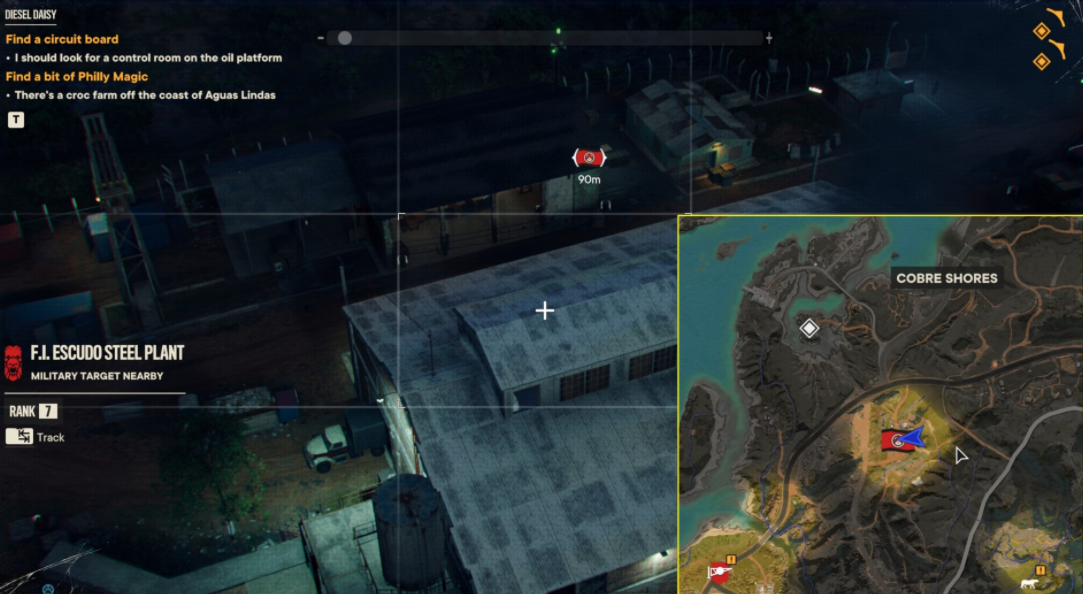 Первый объект защищают сектанты, у второго собралась куча безумных индюшек, третий объект утащила собака, приласкайте её и она бросит его на землю. Четвертый находится на силосной башне в орлином гнезде. Чтобы туда попасть, нужно забраться на резервуар, который находится чуть левее. Затем нужно немного попрыгать – сначала на резервуар посередине, а затем на площадку в башне. После сбора всех четырех предметов задание будет выполнено.