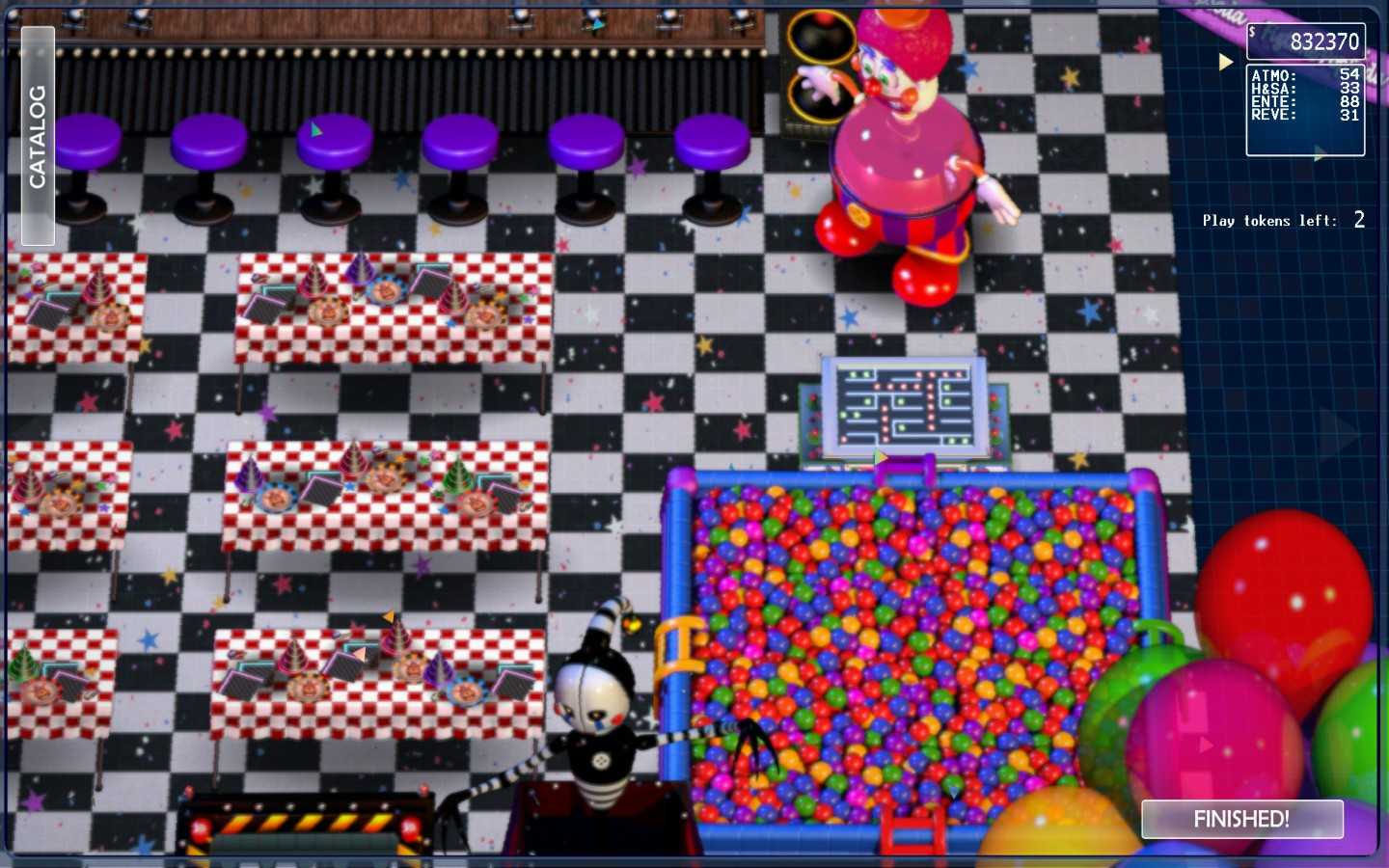 - Второй – происходит переход на «темный» режим». Появляется электронный аниматроник. Он запугивает игрока: против него можно использовать лазер, но не слишком часто – это грозит снижением прибыли. По прохождению режима игрок получает вознаграждение, при проигрыше – лишается денег.