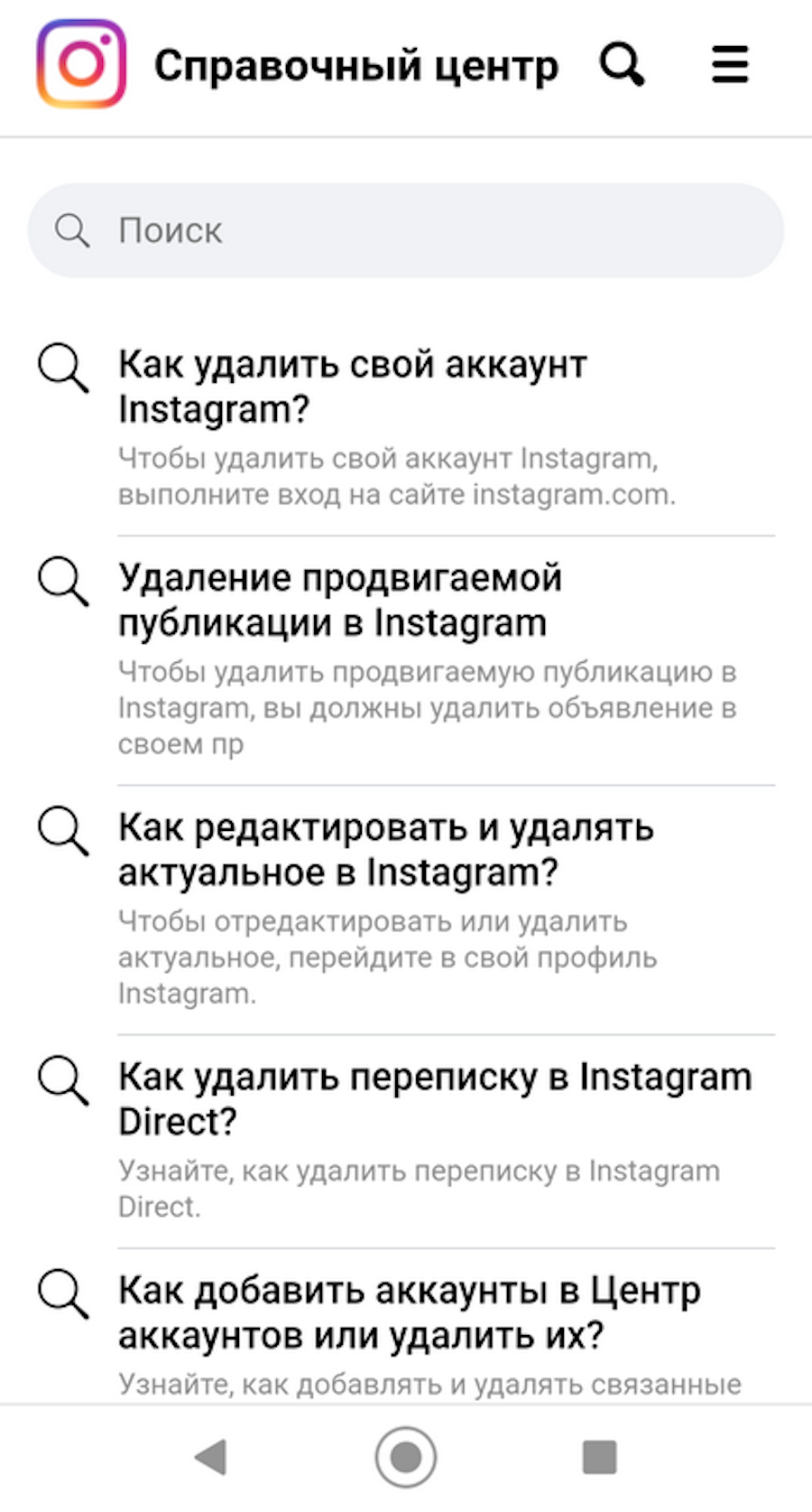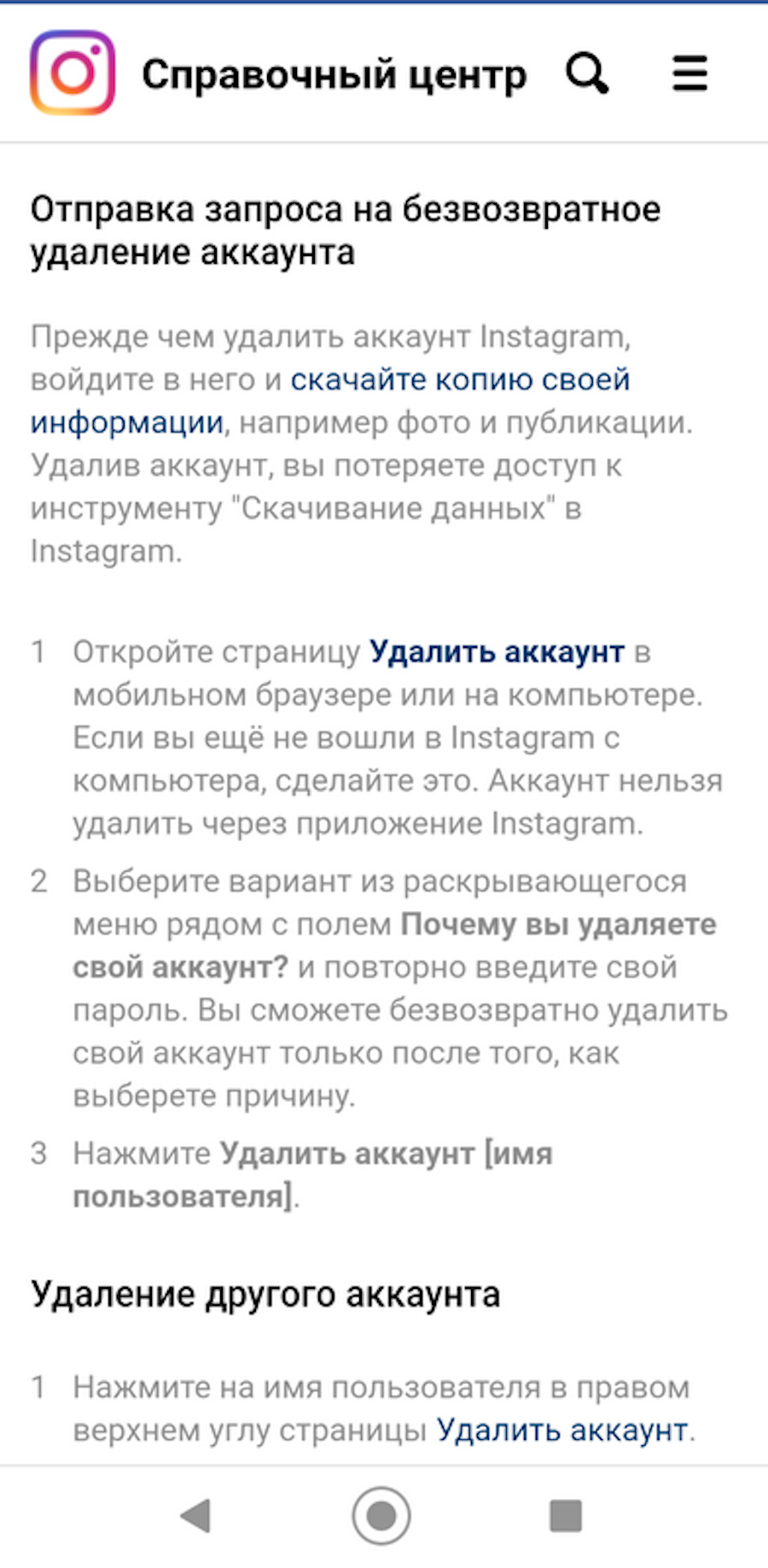 перейти в статью «Как удалить свой аккаунт в Instagram»;