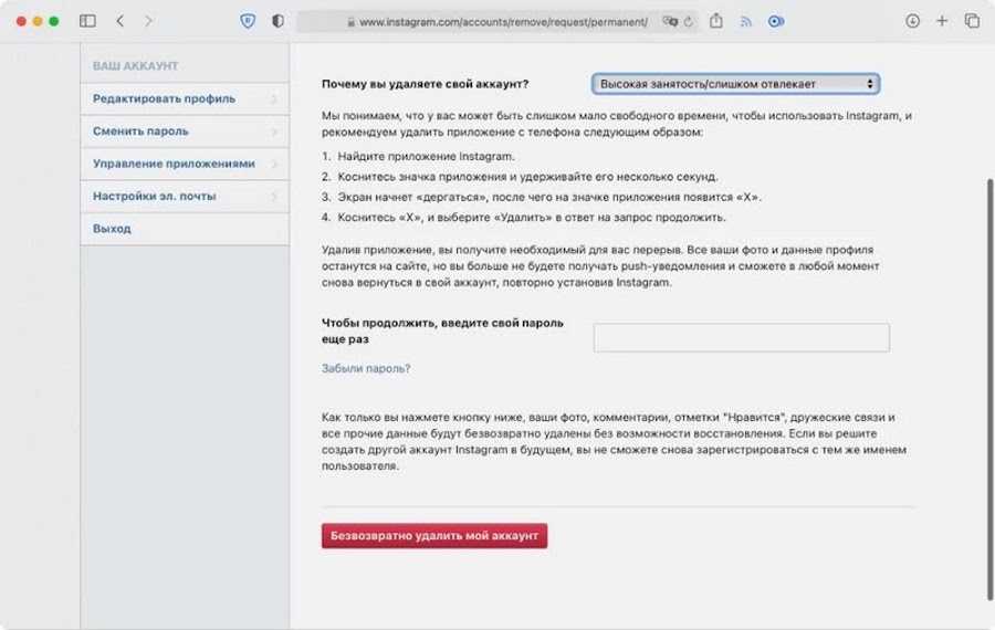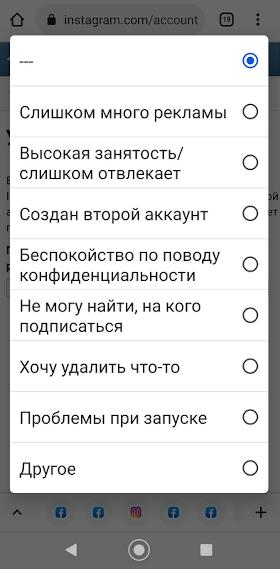 Чтобы удалить профиль Instagram с помощью телефона, потребуется предпринять больше шагов: