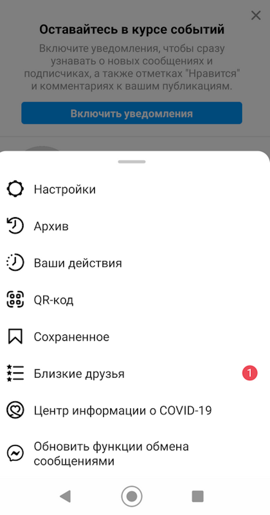 войти в свой профиль в приложении и нажать на пункт «Настройки»;