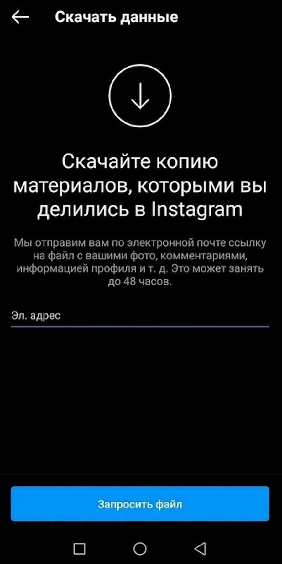 Перед удалением профиля Instagram предложит сохранить данные из него. Для этого надо отправить запрос на загрузку. После этого на электронную почту в течение 48 часов придет письмо со ссылкой, по которой можно будет скачать фото и видео. Запросить копию данных можно также через приложение Instagram для Android и iPhone. Для этого нужно открыть меню в профиле, перейти к разделу «Настройки» — «Безопасность» и выбрать пункт «Скачивание данных». Далее потребуется ввести адрес электронной почты и пароль от аккаунта.