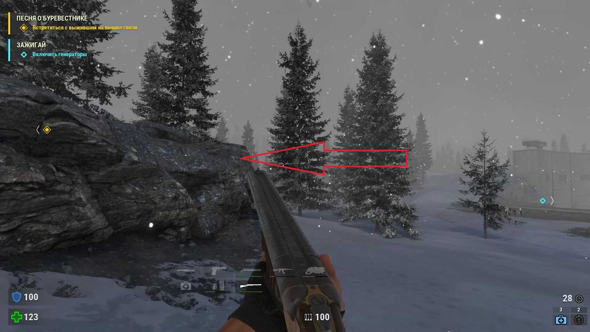 - Когда зачистите деревню и вновь окажетесь на железной дороге, идите вдоль поезда справа, чтобы обнаружить за камнями тайник боеприпасов.
