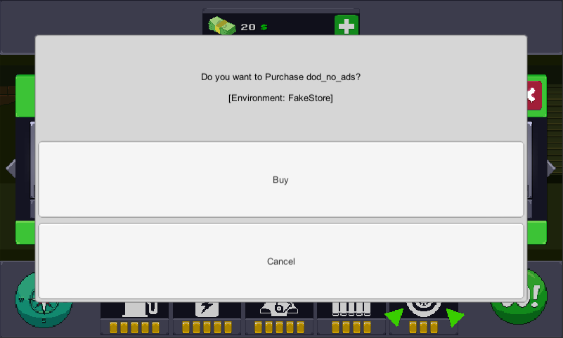 Теперь можете запустить игру в редакторе и протестировать покупку. При нажатии на кнопку выйдет вот такое окно.