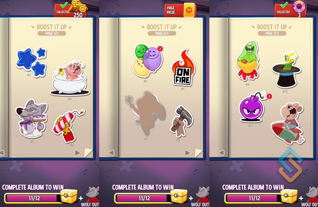 Стикеры — коллекционные наклейки, которые игрок помещает в специальные книги. Собрав определенное количество стикеров, игрок получает награду в виде бустеров, золота (основной игровой валюты), спинов — бесплатных прокруток колеса фортуны.
