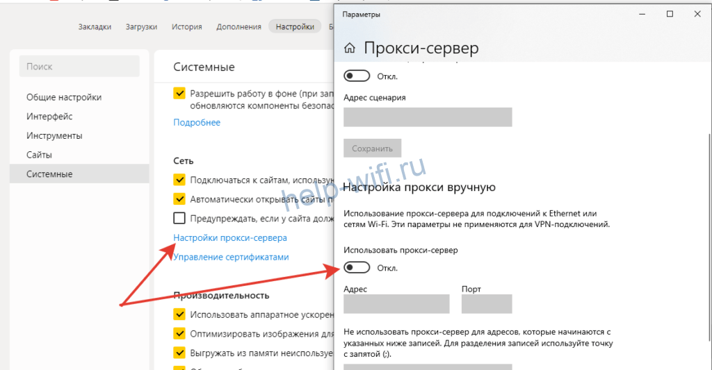 В открывшемся окне с помощью переключателя выключите прокси-сервер, если он у вас используется. Проверьте, работает ли браузер.
