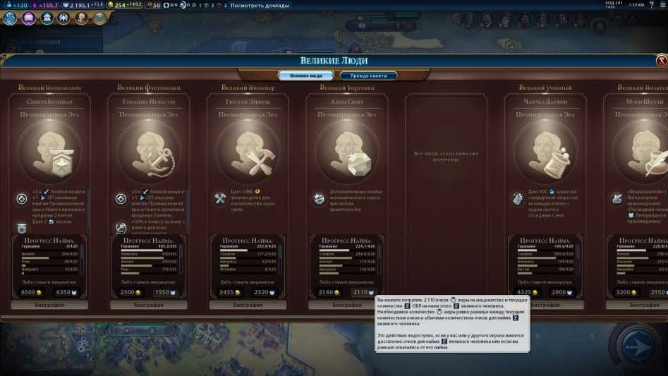 С началом «Нового времени» мы должны успеть получить нескольких великих инженеров и направить их в слабо развитые города, для улучшения их условий. Направляем науку в исследование «Сталеварение» и после завершения исследования начинаем клепать в «морских» городах – Линкоры, а в «сухопутных» городах – Артиллерию.