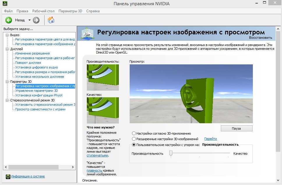 Нажмите правой кнопкой мыши по рабочему столу и выберите ‘NVIDIA Control Panel’, в открывшемся окне найдите раздел ‘Регулировка настроек изображения с просмотром’, в этом разделе установки галочку на ‘Пользовательские настройки с упором на:’ и перетащите ползунок в левую крайнюю часть на ‘Производительность’.