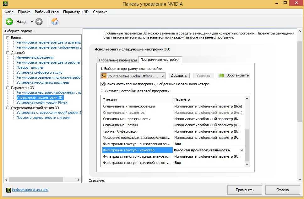 Далее зайдите в раздел ‘Управление параметрами 3D’, перейдите в подраздел ‘Программные настройки’, в меню ‘Выберите программу для настройки’ найдите Counter-Strike: Global Offensive. В настройках найдите параметр ‘Фильтрация текстур — качество’ и установите его на ‘Высокая производительность’.