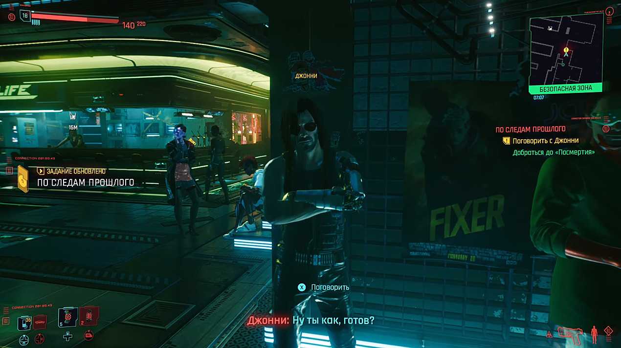 Отправляйтесь в клуб «Посмертие». У входа появится Джонни, после недолгого разговора с рокером вам нужно принять таблетки.