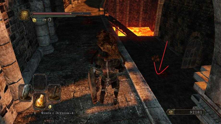 - Вестибюль старого короля (Тлеющее озеро): сломайте ту же иллюзорную стену, которая упоминалась для осколка флакона Эстуса. Однако вместо того, чтобы идти налево, продолжайте движение вперед и спрыгивайте вниз. Убейте двух Тлеющих Гру и спуститесь направо от холла. Посмотрите вверх и сбейте гнилую плоть, чтобы она не атаковала, а затем возьмите осколок с того места, где она приземлилась.