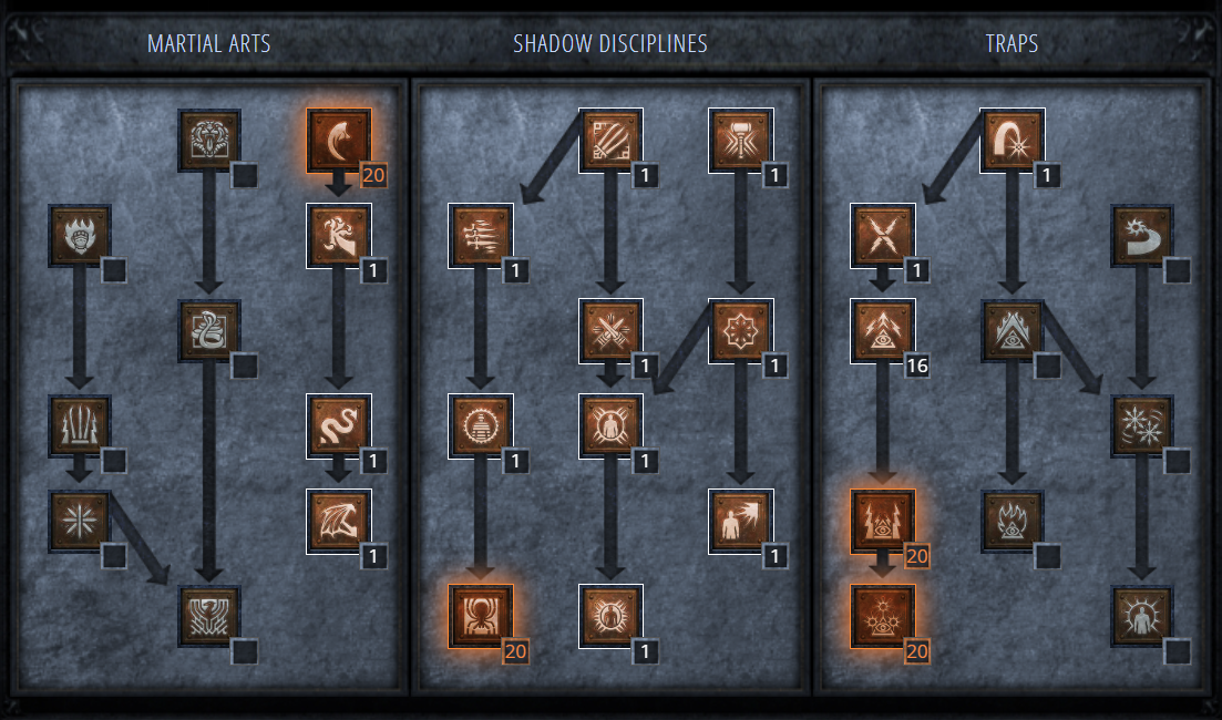 У убийцы есть два основных билда: Мастер ловушек или Мастер боевых искусств. Хотя оба имеют равные достоинства, сборку ловушек намного сложнее выполнить, поскольку она включает в себя сложные расстановки ловушек и манипуляции с движением врага. Поэтому мы будем придерживаться Dragon Talon Kicksin как лучшего по мощности и удобству использования.