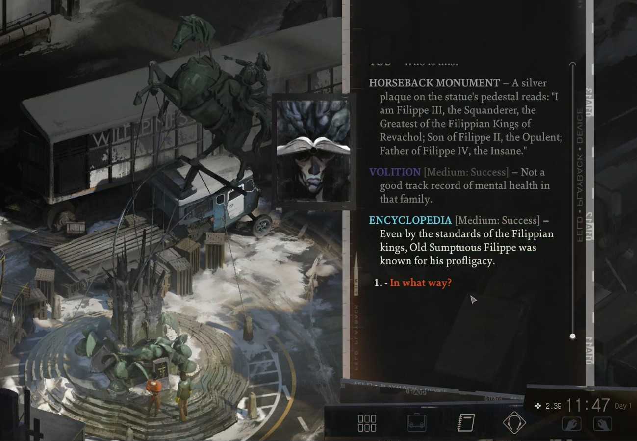 Во время диалогов с персонажами, всегда прислушивайтесь к мыслям вашего героя касательно разговора. Так вы сможете получить ценные сведения и дополнительную информацию о том или ином вопросе. Кроме того, атрибут Риторика поможет вам в допросе подозреваемых, но если вы столкнулись, например, с какой-нибудь прачкой, о9н вам не поможет. Именно поэтому всегда следите за ходом мыслей вашего персонажа, чтобы найти правильный ответ во время диалога. Внимательно изучите каждый атрибут, чтобы понять, как работает игровая механика. К примеру, логика поможет вам сложить многие вещи воедино, но она может негативно сказаться на лести.