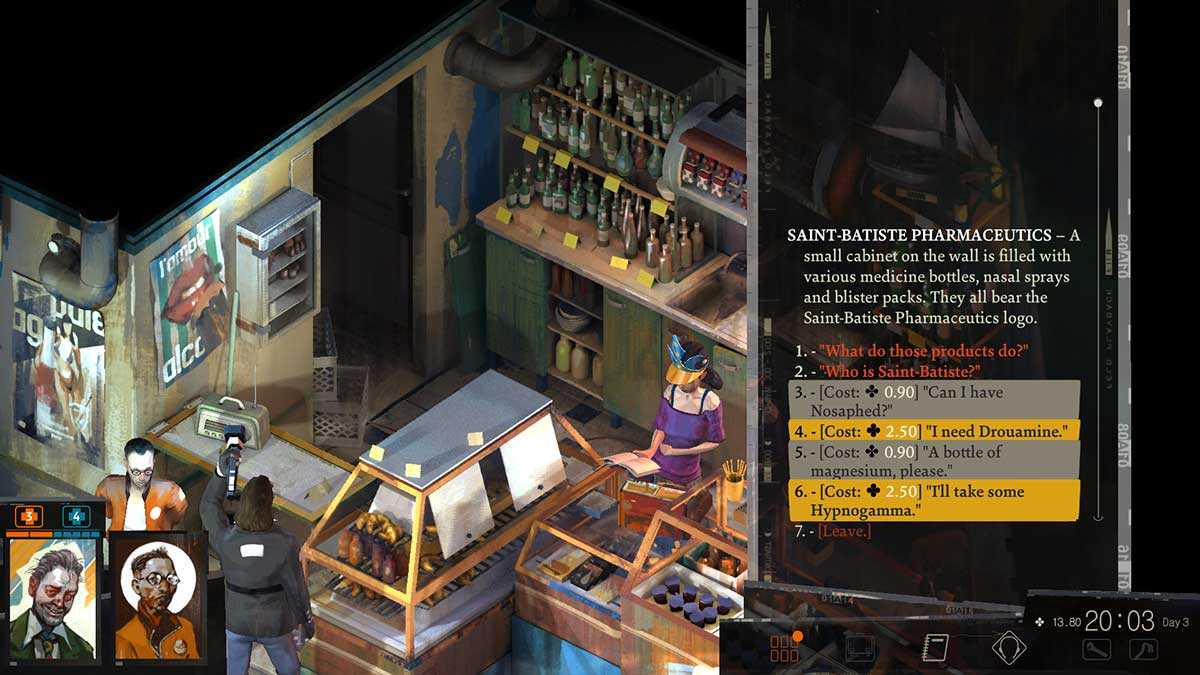 Чтобы вылечиться, вам потребуется купить лекарства, которые продаются в аптеке Frittte рядом с отелем, где начинается игра. Привычный экран инвентаря в игре отсутствует, но есть пользовательский интерфейс в левом нижнем углу экрана, в котором и можно выбрать предмет для исцеления