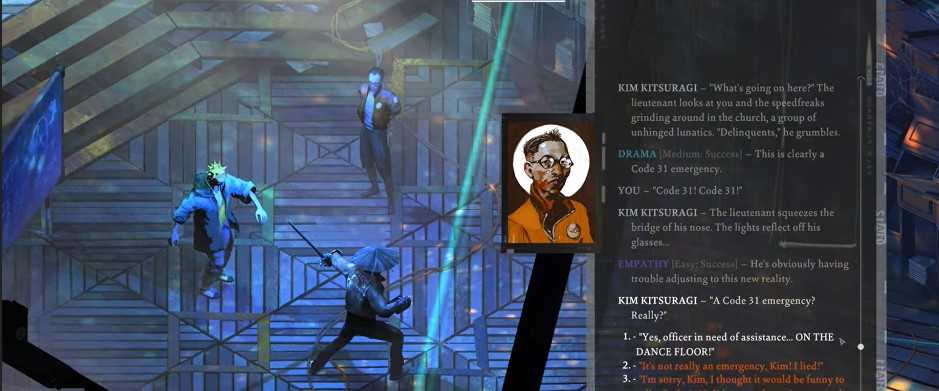 Encyclopedia provides facts and figures about the world, making sense to make it the signature skill. Espirit de Corps is knowledge of police procedures, culture, and fellow policemen, including your partner. This skill chimes relevant anecdotes, present or past, from the perspective of other officers. It also peeks inside the mind of Kim, granting access to his feelings and thoughts that he mostly keeps to himself.
