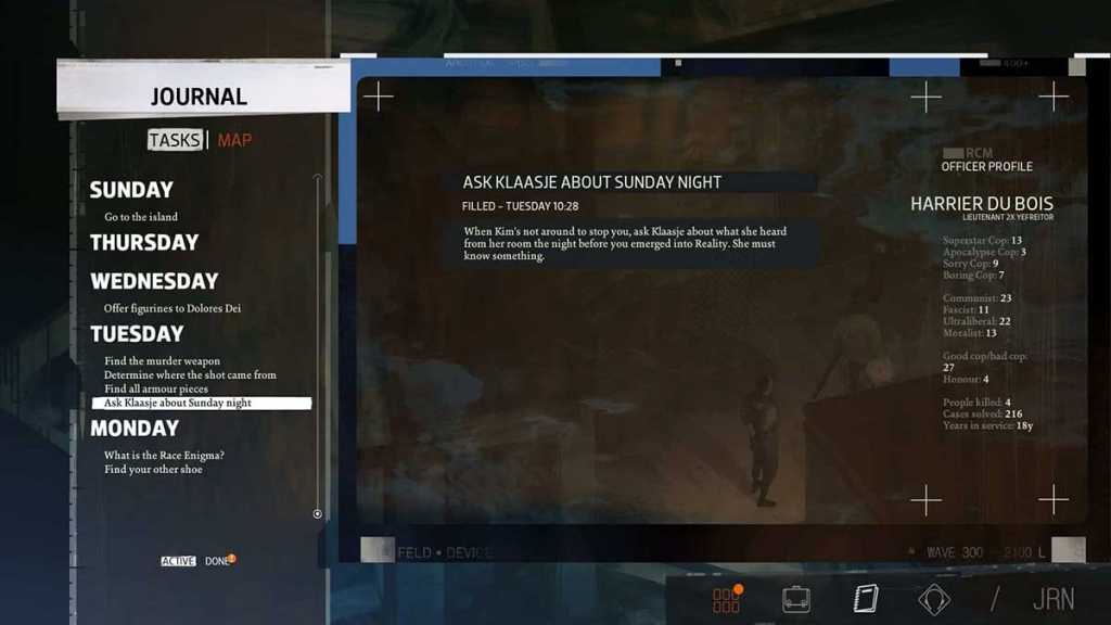 На самом деле это касается большинства «основных» задач в Disco Elysium. Основные задания, как правило, многоступенчатые и закончить их сразу не получится. Вам, вероятно, понадобится больше информации, более высокие навыки и/или бонусы от одежды, чтобы продвинуться в расследовании. Но! Начало выполнения ключевых задач часто может дать вам столь необходимое направление расследования. Вы сможете сориентироваться на том, чего ещё не знаете, и определиться, на каких целях необходимо сосредоточиться. Некоторая предварительная информация может даже помочь вам собрать улики, которые вы сможете использовать в дальнейшем.