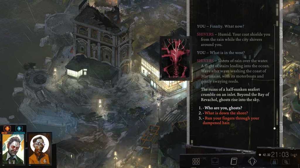 Вы могли заметить часы в правом нижнем углу экрана. Это время суток в Disco Elysium, и оно может работать не так, как вы ожидаете. Время меняется каждый раз, когда вы взаимодействуете с объектами, своим подсознанием или другими людьми. Вы тратите около одной минуты на каждые 1-3 варианта диалога.