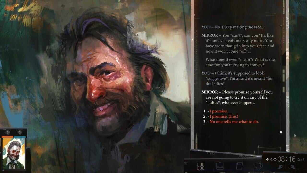 Игра постоянно решает, как эти черты реагируют, взаимодействуют и общаются с персонажем, будто они – второстепенные герои. Вы буквально ведете диалог с самим собой, как с каким-нибудь встреченным NPC: посмотрев в зеркало, протагонист может устроить допрос собственному подсознанию или, например, соврать своему отражению.