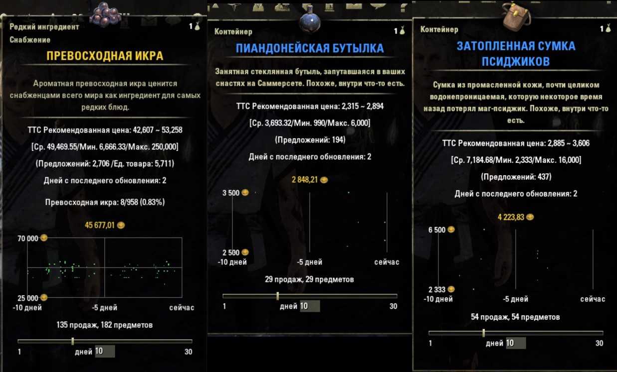 После получения рыбы — разделываем ее или продаем. В случае если вы разделываете её рыбу, то у вас будет небольшой шанс получить превосходную икру. Превосходная икра используется для создания банок и стоит от 40 до 50 тысяч. Со 100 рыб в среднем падает от 1 до 3 штук превосходной икры. Мною было замечено, что использование маринованной рыбы по — артейумски перед разделкой рыбы немного повышает шанс получения превосходной икры. Лучше всего рыбачить на Саммерсете и Артейуме, так как при ловле с небольшим шансом вы будете получать пиандонейские бутылки (Саммерсет) и затопленную сумку псиджиков (Артейум). С пиандонейских бутылок выпадают страницы стилей и различные ремесленные материалы, а с сумки псиджиков выпадают рецепты: маринованной рыбы по-артейумски, артейумского походного бульона (к сожалению все они привязаны).