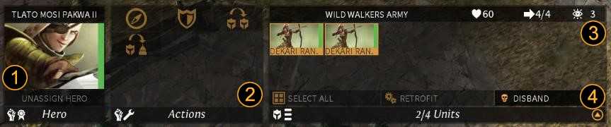 - Действия армии. Некоторые могут быть неактивными в зависимости от ситуации (например, кончились очки движения)