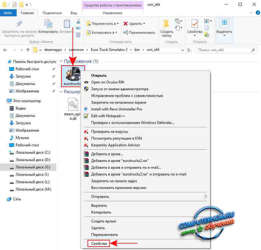 После этого нажимаем на файл «eurotrucks2» и выбираем пункт «Свойства».