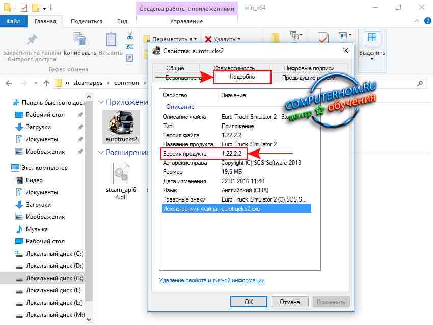 После всех выполненных действий на вашем компьютере откроется «Свойства игры», в этом окошке, вам нужно будет нажать на вкладку «Подробно», после чего вам будет доступна информация об установленной версии на вашем компьютере. В пункте «Версия продукта» будет указана версия ets 2. Теперь давайте рассмотрим второй способ.