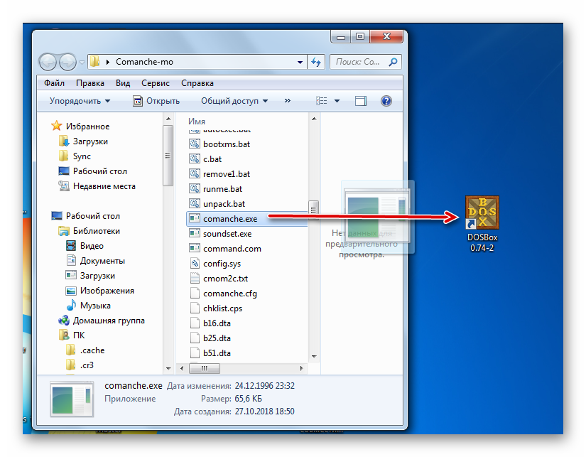 Теперь необходимо открыть «Проводник», свернуть его в окно на «Рабочем столе» и войти в каталог, содержащий исполняемый файл игрового приложения, которое требуется запустить. Чаще всего этому объекту присвоено расширение EXE и он содержит в своем наименовании название игры. Щелкните по нему левой кнопкой мыши (ЛКМ) и, не отпуская её, перетащите этот файл на ярлык DosBox.