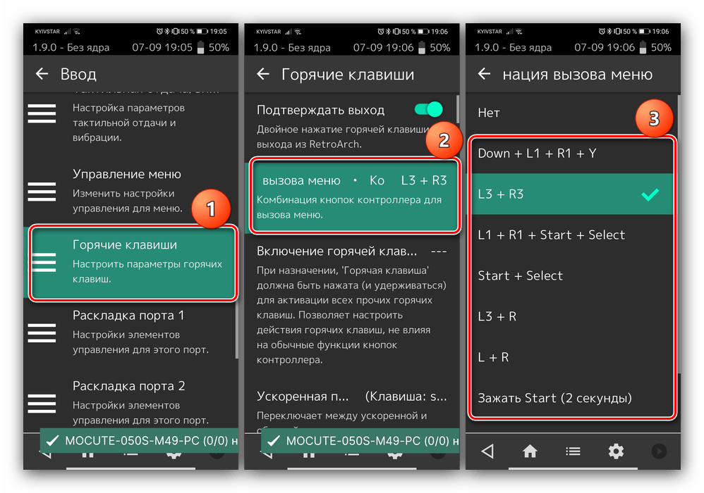 После назначения кнопок требуется дополнительно задать сочетание для вызова меню эмулятора – вернитесь на страницу «Ввод» и воспользуйтесь пунктом «Горячие клавиши», в котором выберите «Комбинация вызова меню» и установите желаемую.