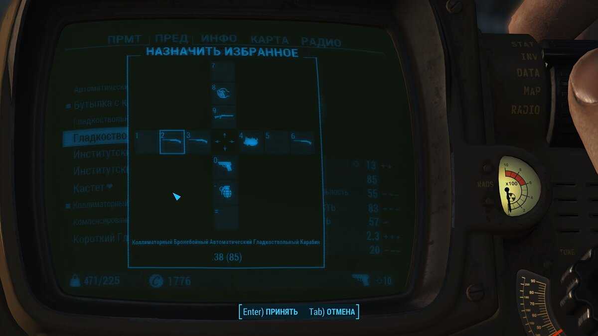 Запускаем Пип-Бой, открываем вкладку «Предметы», подменю «Оружие», выбираем нужный ствол, гаджет или предмет: