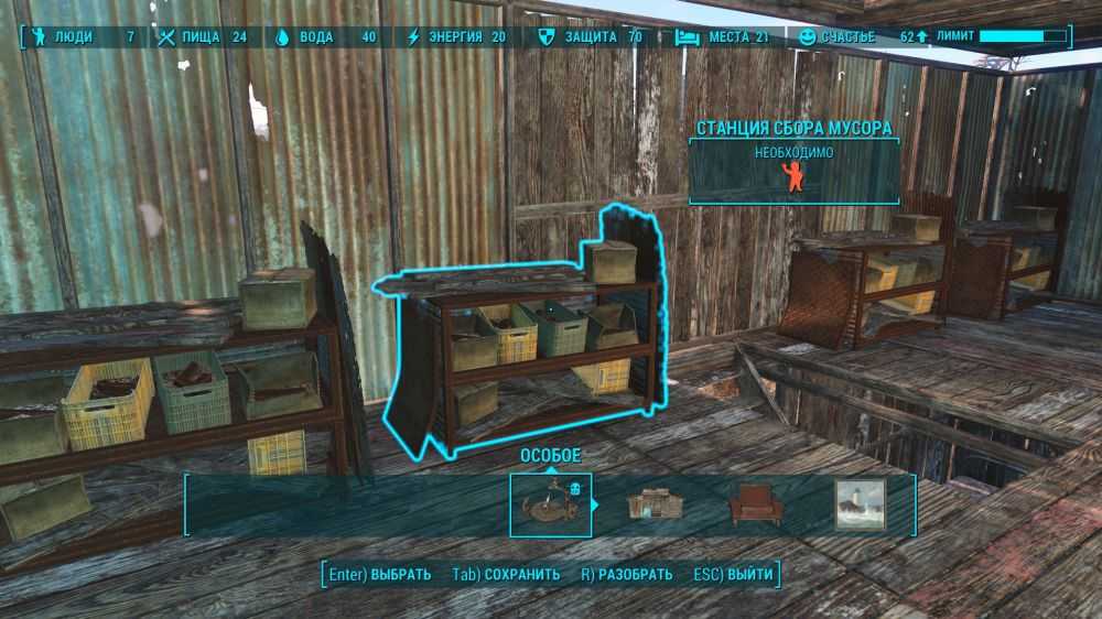 Все безработные поселенцы будут собирать один случайный мусор в день, который автоматически добавляется в инвентарь мастерской. Поселенец, назначенный на очищающую станцию, вместо этого собирает два случайных мусора в день. Как только общее количество мусора в мастерской достигнет 100 + (население × 5), в этом случае в мастерскую не будет добавляться мусор. Иными словами, если у тебя 20 поселенцев то в мастерской может быть 100 + 20*5 = 300 мусора. Каждый сборщик собирает по 2 случайных элемента мусора в день, безработные по одному. Чтобы назначить поселенца, войдите в режим мастерской, выберите поселенца, настройте таргетинг на станцию и нажмите назначить. Можно проверить назначение в режиме мастерской, выделив станцию и проверив, что значок поселенца изменился с красного на текущий цвет пользовательского интерфейса. При подсвечивании поселенца следует увидеть значок ворона, и если оба отстойника и станция находятся в пределах прямой видимости, станция, к которой они привязаны, также будет подсвечена. Пока игрок находится на поселении, назначенные поселенцы будут периодически взаимодействовать со своей станцией, используя на нее паяльную лампу. В отличие от работников, отнесенных к земледелию и обороне, поселенцы не будут работать на нескольких очистных станциях, даже если они находятся в непосредственной близости. Станция очистки может быть повреждена во время атаки на поселение, но, в отличие от большинства других объектов поселений, она не отображает никаких видимых признаков урона. Чтобы определить, повреждена ли убирающая станция или нет, ее необходимо просмотреть в интерфейсе мастерской. Если он поврежден, появится возможность его ремонта, для чего требуется одна сталь и одна древесина. Поврежденная станция не будет производить ресурсы до тех пор, пока не будет отремонтирована. Убирающая станция находится в разделе Ресурсы → Разное. материалы: Требования: Производит: Сталь (3) Дерево (5) мастерская Станции очистки являются дешевым методом снижения уровня безработицы в любом населенном пункте, который необходим для того, чтобы радиомаяк для найма продолжал функционировать. Никакие новые поселенцы не присоединятся к поселению, в котором более четырех поселенцев являются безработными. В то время как станции не генерируют денежный доход и не увеличивают счастье, как это делает большинство магазинов, им требуется гораздо меньше ресурсов и льгот. Они также требуют меньше места, чем магазины, что позволяет им построить в достаточном количестве, чтобы назначить каждому поселенцу работу. fallout.wikia.com/wiki/Scavenging_station
