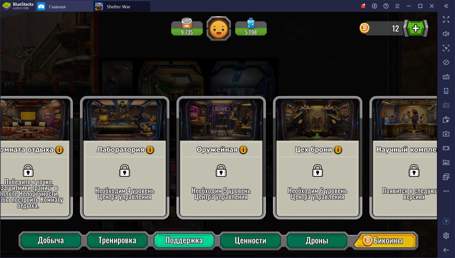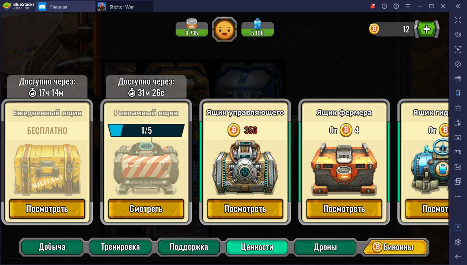 Ценности. Здесь располагаются ящики с лутом и ресурсами, которые можно приобрести за Бикоины — особую валюту Shelter War.