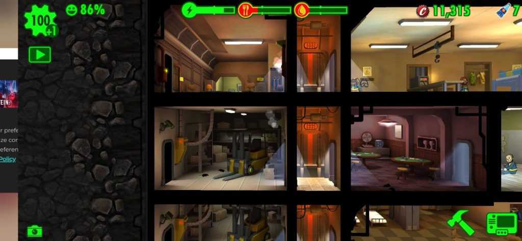 Вы думаете, что для счастья вашим жителям достаточно находиться вне пустоши и вдали от яо-гаев, но нет! Они также хотят определенного уровня комфорта и удовлетворения своих потребностей в подземном доме. Хорошая новость в том, что если долго нет пожаров, трупов, лежащих вокруг, и радиоактивных тараканов с кротокрысами, рейдерами и когтями смерти, то уровень счастья населения будет по крайней мере 50% (он отображается в левом верхнем углу экрана).