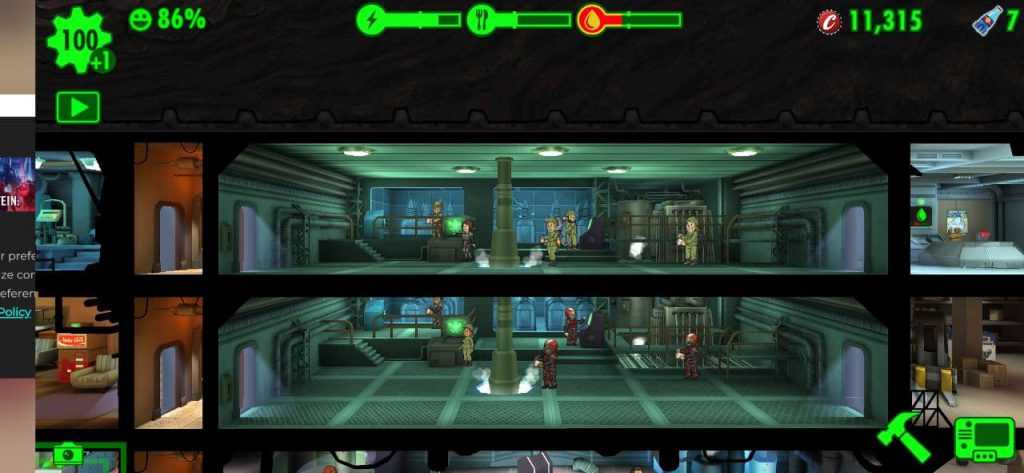 - реальное передвижение поселенцев между комнаты крайне редко. Обычно в Fallout Shelter вы размещаете поселенца в зависимости от уровня прокачки тех или иных скиллов в определенную комнату для добычи ресурсов и оставляете его там навсегда. Так что особой необходимости в обеспечении мобильности передвижения в убежище нет.