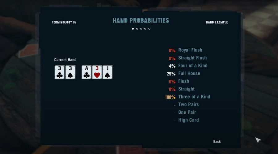 Как только вы примете решение, начнется второй этап. Будет сдан флоп, и в этот момент на стол выкладываются три общие карты для всех желающих. И снова у вас будет выбор: фолд, чек, колл, рейз или олл-ин. Если вы не сильны в покере или вам трудно запомнить покерный рейтинг, то вот несколько вещей, которые могут вам помочь. Когда вы смотрите на карты, игра покажет вам предварительный просмотр ваших карт, карты на доске и ваш покерный рейтинг на данный момент. Другой способ, который может вам помочь, — выбрать опцию помощи в левом нижнем углу экрана. В результате появится экран с рейтингом покера и вероятностью получения определенной руки. После того, как все сделали ставки, начинается третий этап, когда дилер сдает четвертую карту сообщества, также известную как карта разворота. Снова начинается очередной раунд ставок, в котором у вас будет выбор: чек, колл, фолд, рейз или олл-ин. Пятый и последний этап — это когда наконец-то выпадает Ривер, и игроки проходят последний круг ставок, прежде чем окончательно определить победителя.