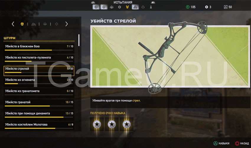 - Завершение испытаний. В меню главного героя имеется отдельная вкладка, в которой перечислены все испытания и условия их прохождения. Награда за завершенное испытания составляет 1-3 очка. Чем сложнее испытание, тем выше награда. В игре предусмотрены разные испытания. Определенное количество убийств из конкретного оружия, убийства определенным способом (с высоты, транспортом и т. п.), охота на различных животных, ловля конкретной рыбы и друге. На начальном этапе стоит проходить самые простые испытания. Это позволит купить наиболее полезные перки для усиления главного героя и дальнейшего выполнения более сложных испытаний.
