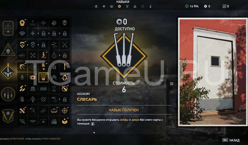 - «Слесарь» (6 очков). Открывать сейфы теперь можно и без горелки. Но, спешить с покупкой данного навыка не стоит, если уже разблокирована горелка, он скорее обеспечивает удобство, но не является крайне необходимым.