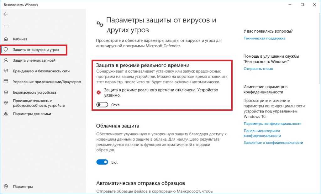 - поставьте переключатель защиты в режиме реального времени в положение «Откл.»;