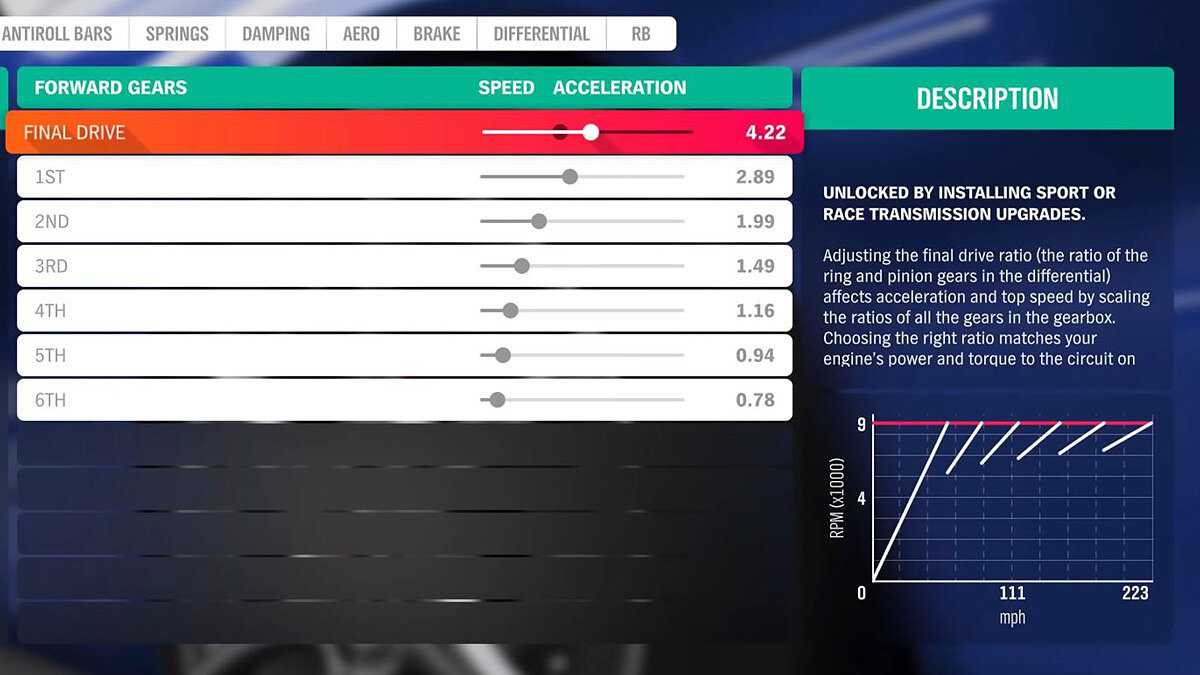Вы должны проверить, хотите ли вы, чтобы определенные передачи имели больший или меньший диапазон. Регулировка передачи — это длительный процесс, который требует множества испытаний и во многом зависит от автомобиля, который вы используете, вашего стиля вождения и типа соревнования, в котором вы хотите участвовать.