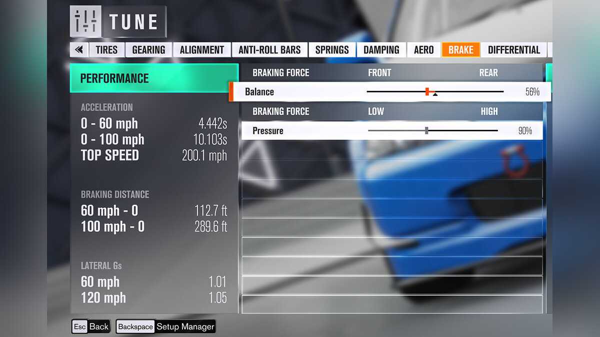 Не добавляйте слишком много, иначе ваши шины будут блокироваться во всех зонах торможения. Для уличных гонок значение от 100 до 115 процентов является хорошим началом, при этом баланс тормозов остаётся в центре