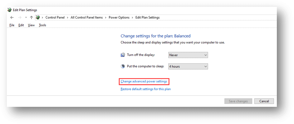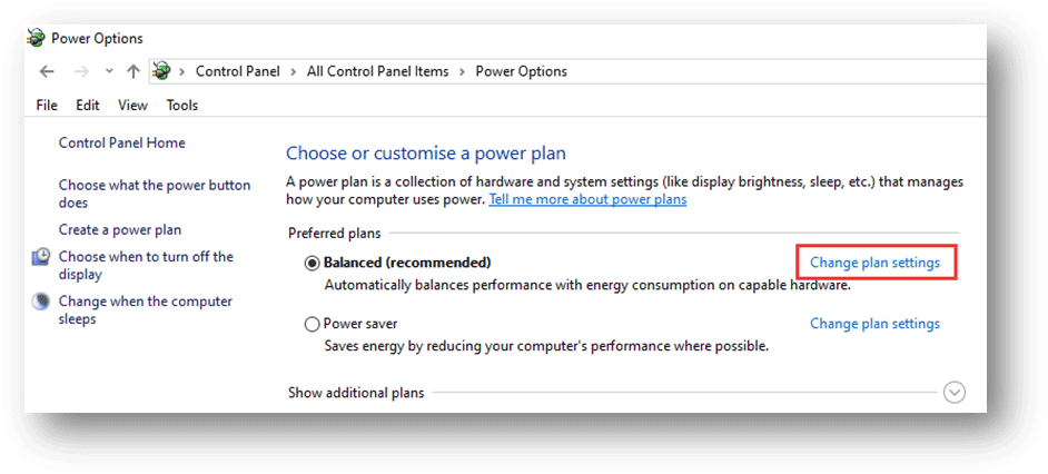 4. Щелкните значок Изменить настройки плана ссылка рядом с Сбалансированный (рекомендуется) в Предпочтительный план раздел.