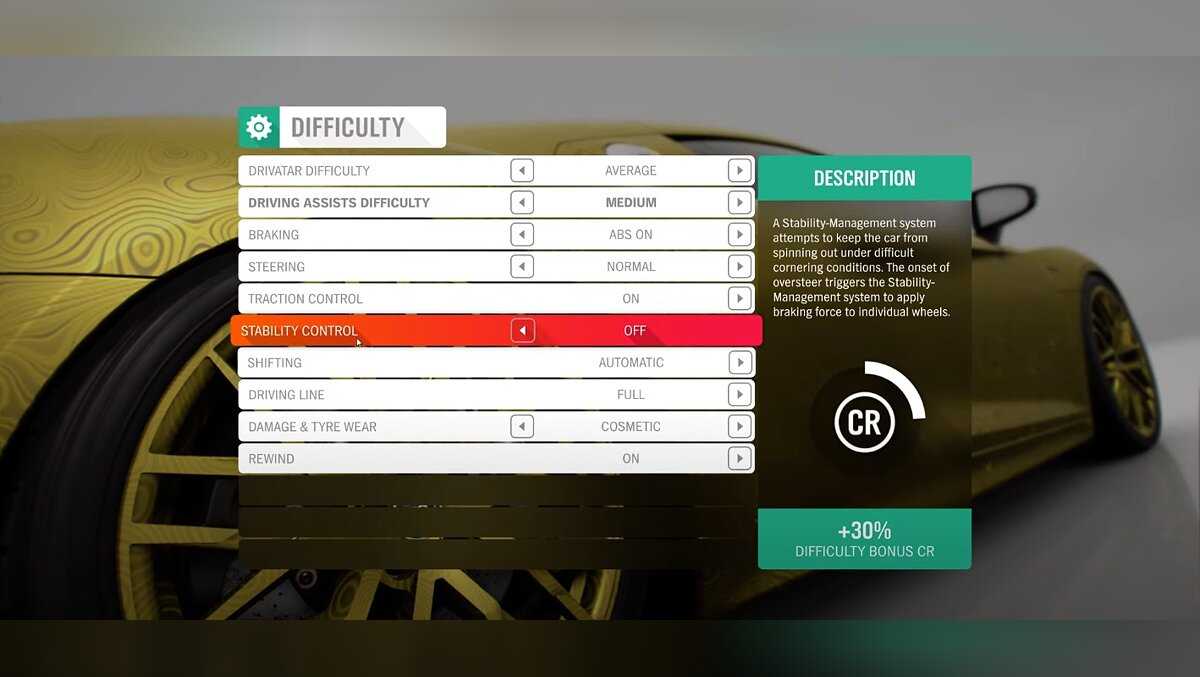 Отключение некоторых вспомогательных настроек управления автомобилем принесёт бонусные кредиты. Также количество заработанных за гонку кредитов частично зависит от настроек сложности, о которых мы поговорим позже. Однако игроки, которые опасаются резко повышать сложность, всё же могут внести некоторые незначительные изменения, чтобы заработать бонусные кредиты при завершении события.