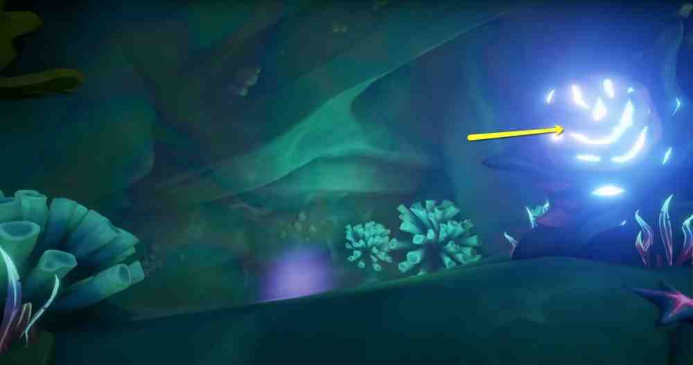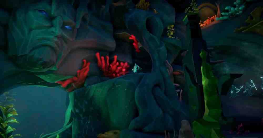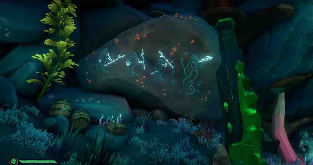 Следуй по на восток-юго-восток к темному туннелю у основания пещеры. Подойдя ближе ты увидишь прозрачный барьер и статую, похожую на статуи русалок в Shores of Gold Tall Tales. Они работают как статуи паромщика из первой части серии Tall Tales «Жизнь пирата». Они помогут тебе либо вернуться на свой корабль, либо вернуться к сохраненной контрольной точке.