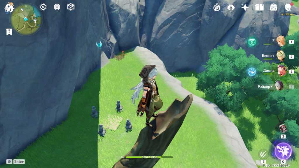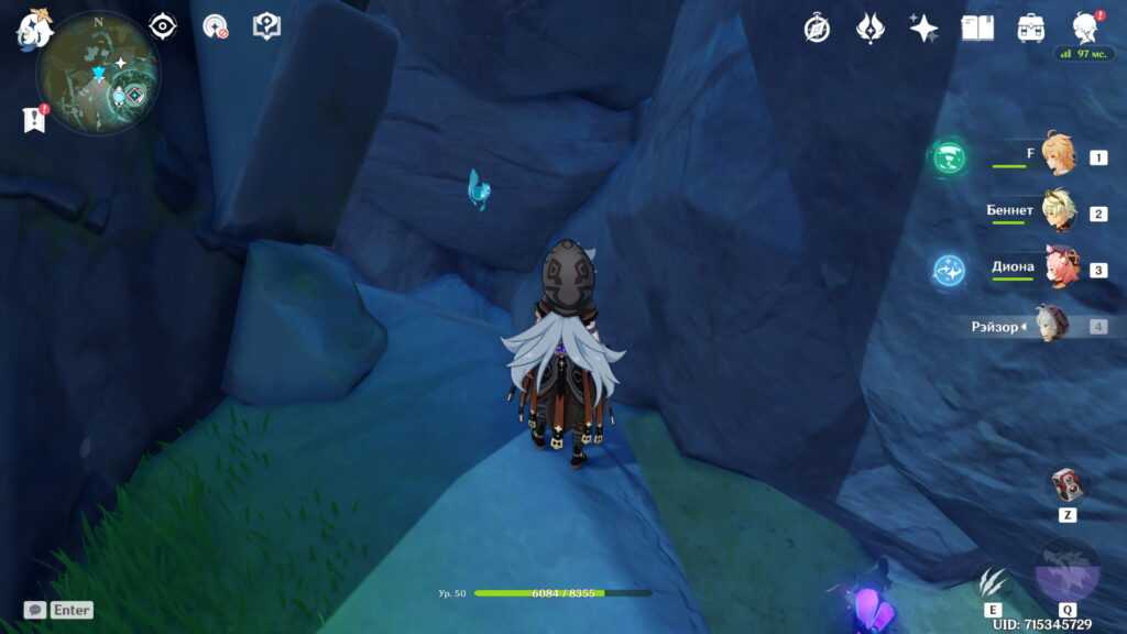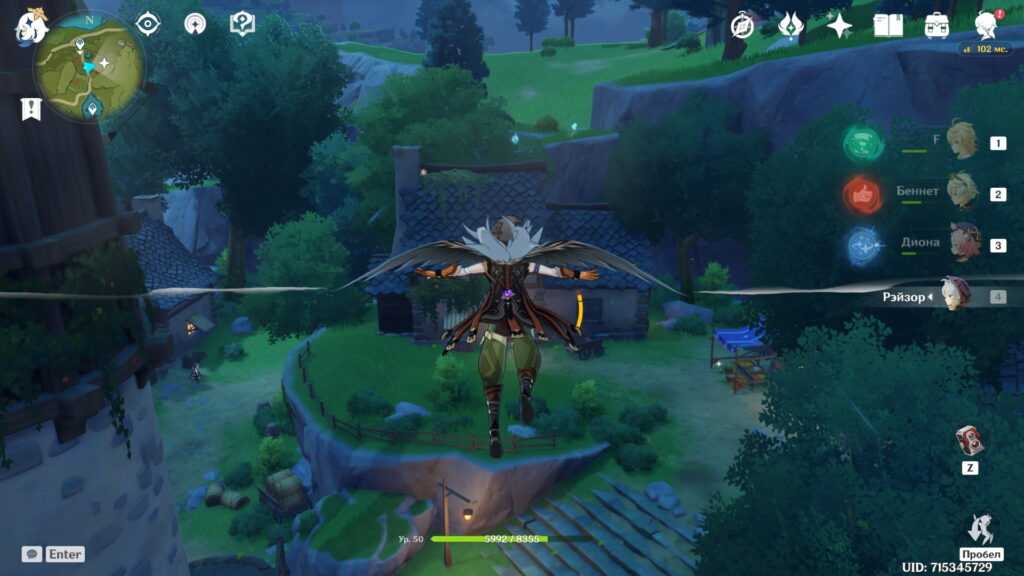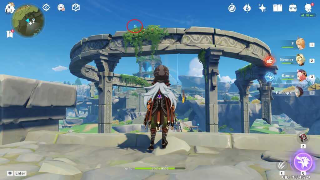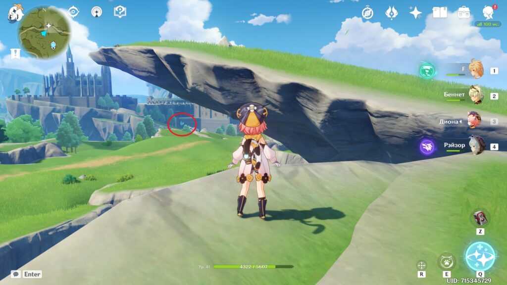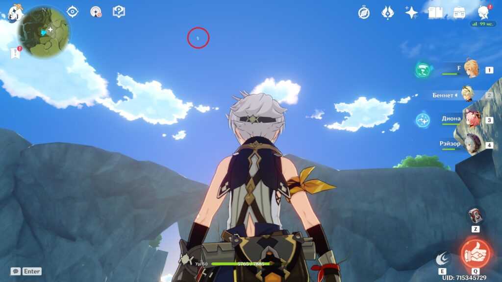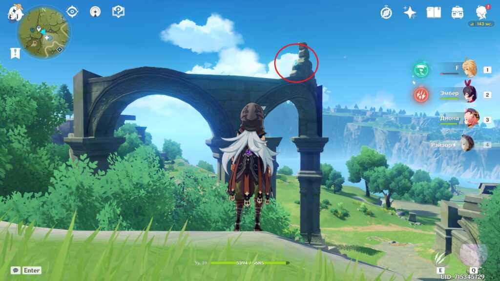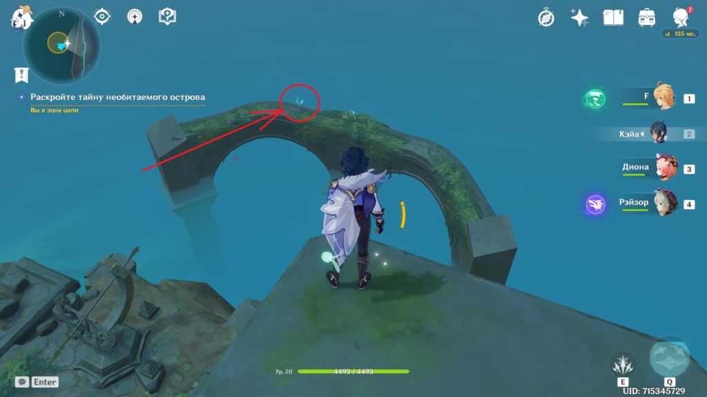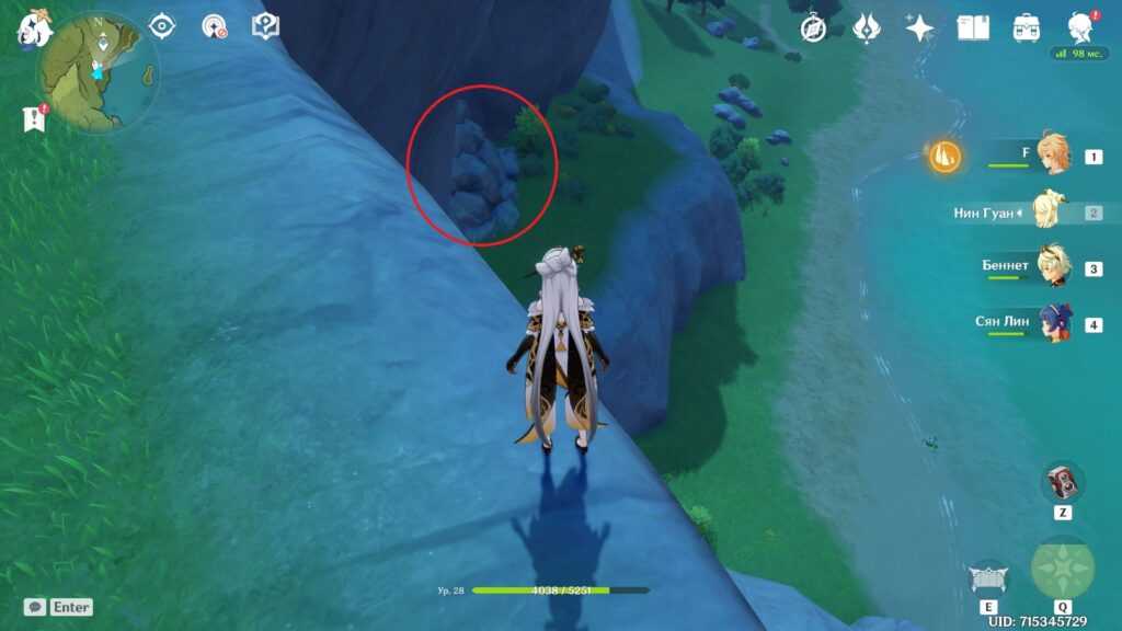 Есть и альтернативный путь. Вы можете долететь до острова с краешка Утеса Звездолова, заодно получив сразу два скрытых достижения. Возьмите в отряд Эмбер и Бэй Доу из-за их чудесных пассивных талантов, помогающих лететь дольше (у Эмбер) и плавать дальше (у Бэй Доу), скушайте еду на выносливость и, если есть, экипируйте инструмент “Веер” за репутацию Инадзумы. Впрочем, можно и без него. Не рекомендуем использовать этот метод с низкой выносливостью.