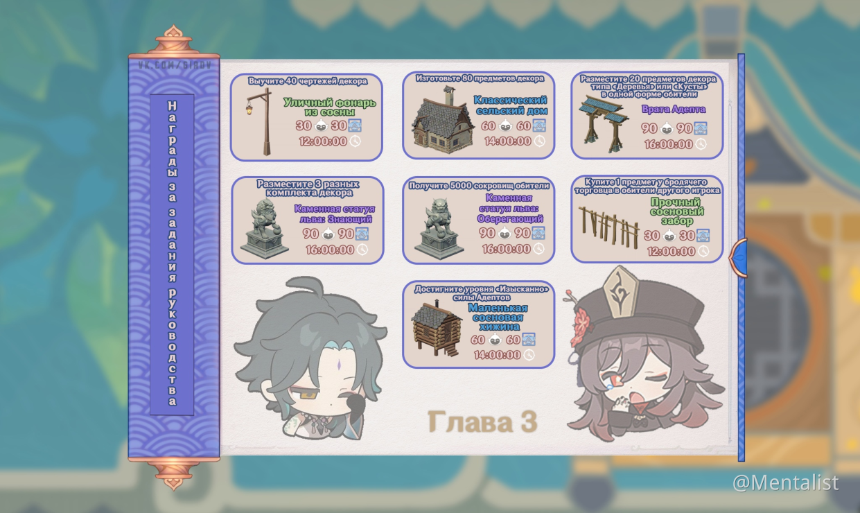 2) Событие «Поймай меня; если сможешь»: Парчовый фонарь: Изысканный павильон; Парчовые занавести; Шелковые занавески: В поисках алого заката; Цветочная ширма: Нефрит и золото; Громоподобный небесный барабан; Фонарь с кисточкой: Украшение улицы; Освещенная сцена: Крещендо