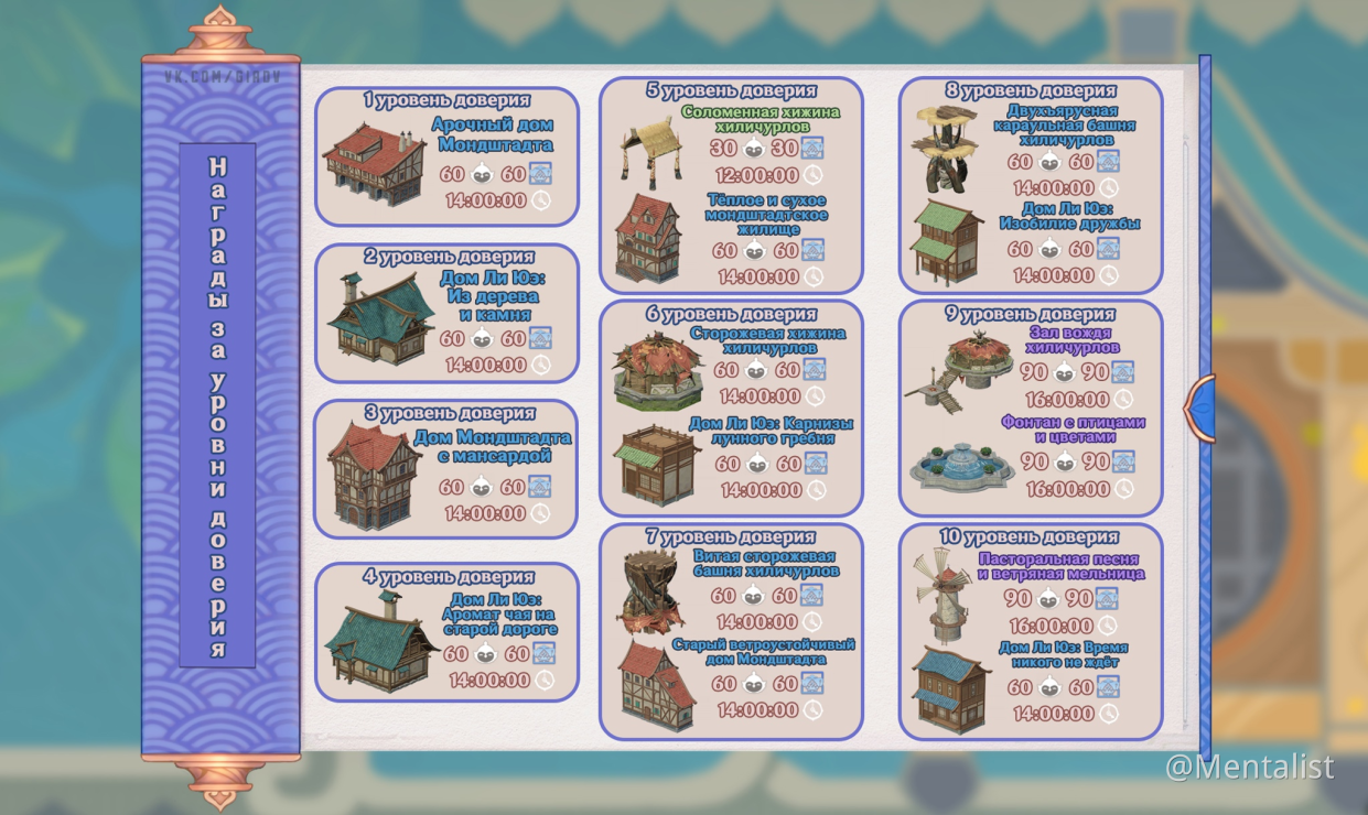 Арочный дом Мондштадта; Дом Ли Юэ: Из дерева и камня; Дом Мондштадта с мансардой; Дом Ли Юэ: Аромат чая на старой дороге; Соломенная хижина хиличурлов; Теплое и сухое мондштадтское жилище; Сторожевая хижина хиличурлов; Дом Ли Юэ: Карнизы лунного гр****; Витая сторожевая башня хиличурлов; Старый ветроустойчивый дом Мондштадта; Двухъярусная караульная башня хиличурлов; Дом Ли Юэ: Изобилие дружбы; Зал вождя хиличурлов; Фонтан с птицами и цветами; Пасторальная песня и ветряная мельница; Дом Ли Юэ: Время никого не ждет.