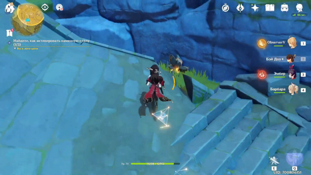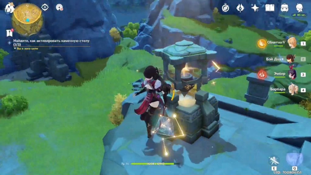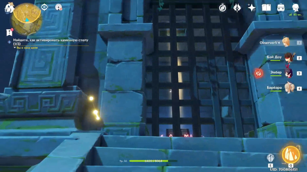 Как только появится светящаяся дорожка, вы сможете подняться по ней. Там вы найдете еще один памятник. Используйте персонажа с Гео, чтобы активировать тотем в центре этого квадрата, чтобы вызвать врагов. Время боя ограничено и составляет 240 секунд, количество врагов 15, уровень врагов 50 лвл. Рекомендуемая команда для финального прохождения подземелья включает персонажей Электро, Крио и Поджигателя в дополнение к обязательному персонажу Гео.